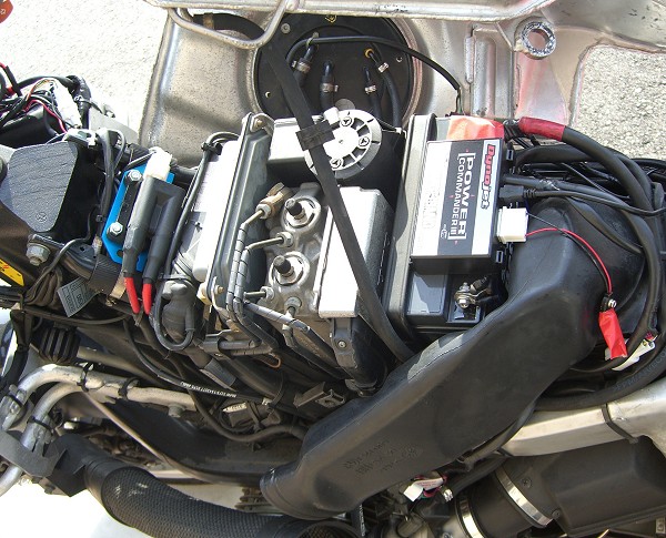 パワコマ取付はO2センサ取り替える手間があるけど、エキパイばらさずできたのでコネクタ差すだけの簡単さ。本体はバッテリー上に設置。