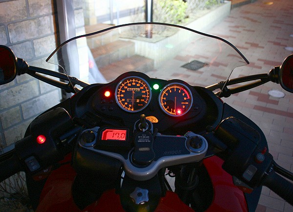 通常時はバーは電圧、デジタル表示は油温にしてます。ボタンをいくつか押せば外気温に切り替え。サーキットでは両方油温にすればいいでしょ。