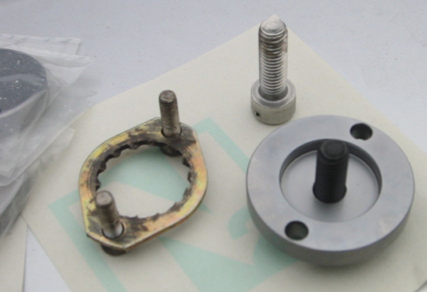 約5千キロで写真のように磨耗して、首振り状態になり、お店からも、このままだと走行不能と御指摘をうけました。そこで、当初付いていたプレートを、ガラクタの山から探し出して寸法を取り、作ってみたのが、右のプレートで、まん中のM8ボルトで、シャフトに固定します。モンジュイの皆さんはどのように対策されているのですか、残り3個あるので、必要ならおわけしますよ。