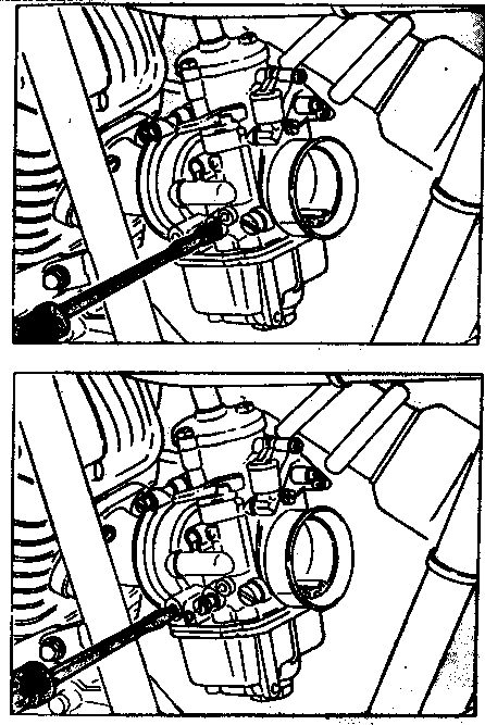 Step 6 - by now you've got the mixture sorted and have probably discovered the bike is idling faster than you want. First, listen to the exhaust beat - is it even? Ideally you want to lower the idle speed on the carbie that is too fast, so that the beat become even. If the beat is already even, you have to back off the idle screws on both carbies in small equal increments. Don't get suicidal if it's hard to pick whether they're even or not - as long as the bike idles at the right speed and sounds okay.
