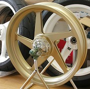 仕上げのウレタンクリア吹きました。色はばっちり! リアと比較してメタリックのフレークがちょっと粗いかなぐらいです。 ちょっと垂れたり本塗り後の足付け失敗してムラになったり、スポーク1本クリア塗り忘れてたり(T.T)、落として傷が付いたり(^_^; もしたけど塗装のいい勉強になりました。下地の作り方、パテの付け方、足付け、脱脂の仕方、サフ/本塗り/クリアの吹き具合等々、自分でやって良かったと思います。 次は900のマルケ3本を赤に塗るか5本を塗り直すか。はてはカウル塗装なんてのも(やっぱこれは頼も-...) オイルレスコンプレッサーとガン買って本格的にのめり込むのも手ですねえ。。(センス無いからやめとこ..) |