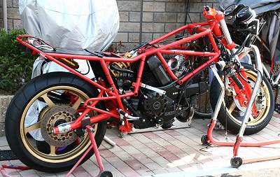 フロントフォーク完了。とりあえず純正リアサス装着。間もなく完成します。