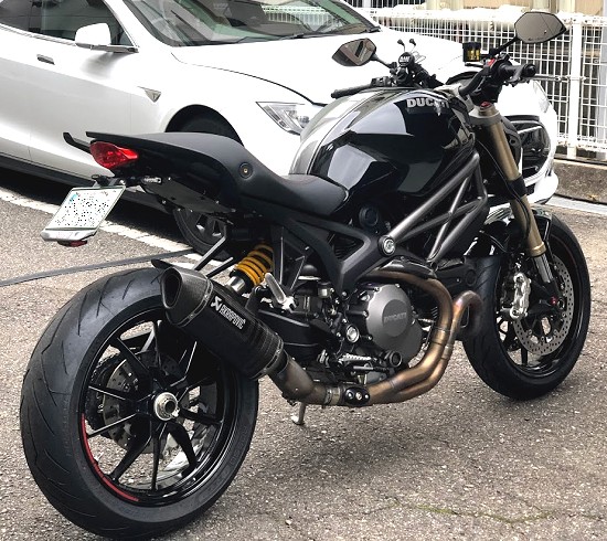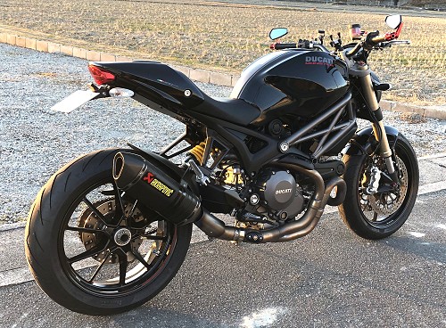 前オーナーからのワンオフのアクラポヴィッチ(S1000RR用加工)に純正モノクロステッカー貼って排気系は完了。燃調は現状でもそう悪くはないがテルミ用ECU付けて様子見の予定。