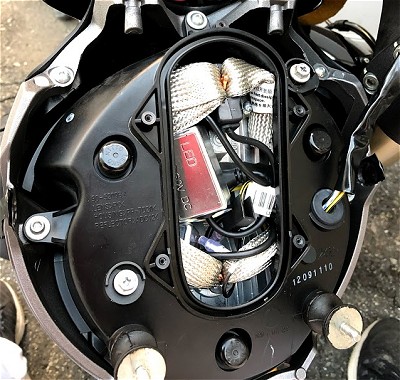 ヘッドライトは、BMW用のHIDが余っていたので付けようと思ったら、内部スペースが狭くしかもデカいバラストも納める場所が全く無かったので、Hi(H1)/Low(H7)共にLEDに。各55Wから各25Wほどへ。