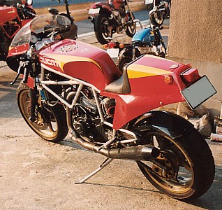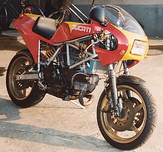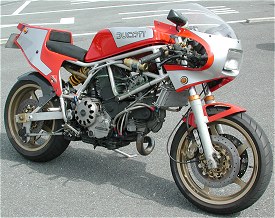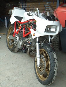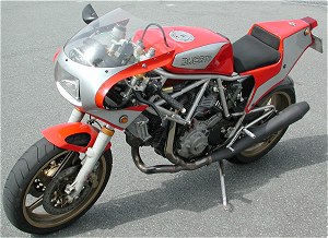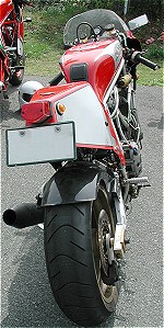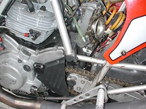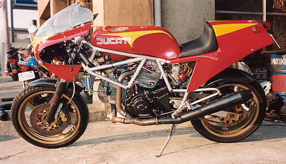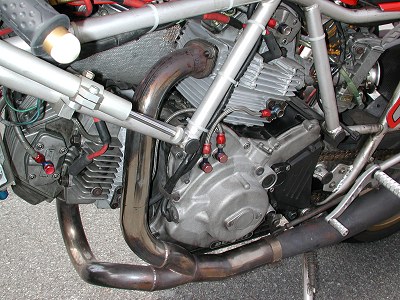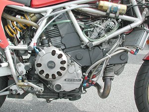 | ①ピストンをVEETWOのハイコンプ ②カムをVEETWOにした ③コンロッドをキャレロにし鏡面加工した ④プーリーをライトウェイトとした ⑤フライホイールをウインドワーズ製の軽量な物に変更 ⑥1次減速ギアをストレートカットプライマリーに変更 ⑦キャブはFCR41 ⑧エキパイはモトエルン製 ⑨マフラーはベルりッキのコピーで出口径を65mmとした。 ⑩ヘッドへのオイル供給は外部ラインとした ⑪点火系については、イグニションコイルを現行のSS900用にして、CDI等 は、92年型の900SS用とした。プラグコードをノロジーとした。 ⑫クラッチは、ハウジングを軽量加工した。 今後考えているエンジンチューニングは、以下の内容です。 ①クランクの軽量、バランス取り ②ミッションのクロス化 |